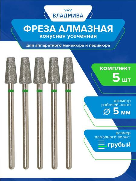 This set features five high-quality diamond burs with a tapered truncated cone shape and coarse grit, each measuring 5.0 mm. The bur's working part has a diameter of 5 mm and a length of 10 mm. Manufactured by TD "VladMiVa," these diamond burs are essential for professional hardware manicures and pedicures. They are expertly designed for nail enhancements, nail art, nail corrections, and the effective treatment of callused skin.