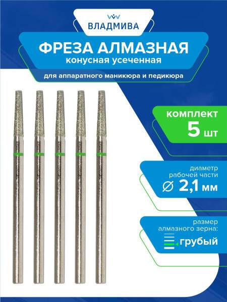 Discover a professional-grade diamond nail drill bit set designed for superior manicure and pedicure treatments. This 5-piece collection features coarse grit truncated cone diamond bits, each measuring 2.1mm in diameter with a 10mm working length. Perfect for nail enhancement, intricate nail design, and precision nail correction, these versatile bits are also excellent for callus removal and rough skin treatment.
