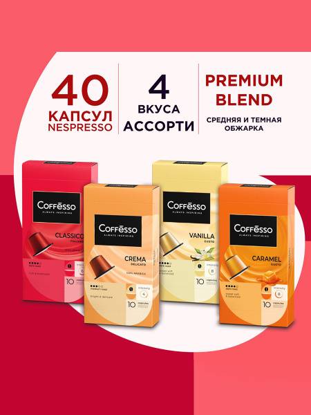 Indulge your senses with the COFFESSO Nespresso compatible capsule variety pack. This assortment features four delectable flavors: the rich Classico Italiano, the smooth Crema Delicato, the sweet Vanilla, and the irresistible Caramel. Each pack contains 10 capsules, offering a diverse coffee experience to brighten your day. Discover your new favorite with this premium blend of classic and exciting tastes. Start your day the delicious way!