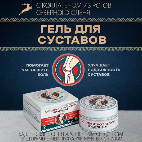 Kol-Horn LONG Joint Gel-Ointment provides fast-acting relief from joint pain and improves mobility after sprains, bruises, and other sports injuries. This powerful formula combines a collagen-peptide complex (CPC), deer fat, flaxseed oil, and turpentine for enhanced nutritional support to your joints, connective tissues, and spine. It promotes natural cartilage regeneration, helps reduce inflammation, and inhibits further disease progression. Easily absorbed, leaving no greasy residue, Kol-Horn LONG is ideal for massage and daily application. Apply 2-3 times daily to affected areas with gentle massage until fully absorbed. A local chondroprotector, recommended for use with massage. 50ml.