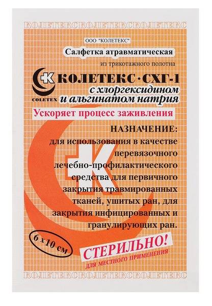 Coletex-CXG-1, Chlorhexidine dressing, Sodium alginate dressing, wound dressing, antiseptic dressing, post-operative wound care, chronic wound care, pressure ulcer treatment, diabetic foot ulcer treatment, wound healing, bactericidal, absorbent dressing, atraumatic dressing, surgical dressing, granulating wound, purulent wound, 6x10cm dressing.