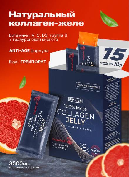 Keywords: Collagen gummies, hyaluronic acid, vitamin C, skin health, hair health, joint health, anti-aging, beauty supplements, collagen peptides, grapefruit, sugar-free, gluten-free, GMO-free, soy-free, PP Lab, EAC certified, natural collagen, beauty from within, collagen supplement, healthy aging.