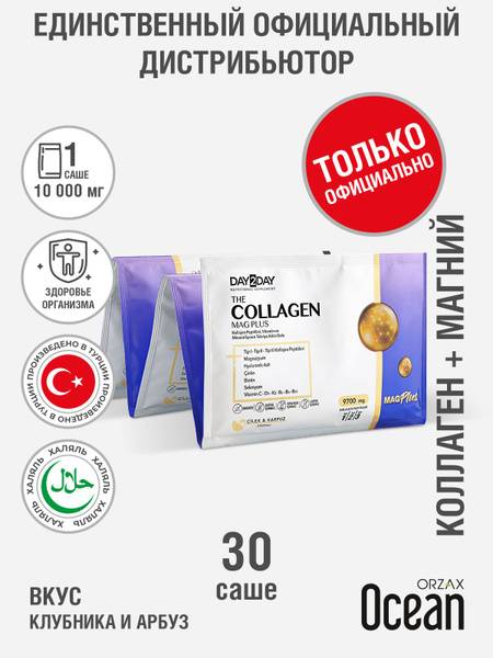 Boost your health and vitality with ORZAX DAY2DAY Collagen Mag Plus, a delicious strawberry and watermelon flavored powder supplement. This comprehensive formula combines 10,000mg of hydrolyzed type I, II, and III bovine collagen peptides with magnesium, vitamins D3 & K2, and essential nutrients like hyaluronic acid, chondroitin, and glucosamine. Specifically designed for men and women of all ages, it's particularly beneficial for supporting joint health, boosting immunity, improving skin, hair, and nail condition, and promoting muscle strength. Each convenient single-serve sachet promotes faster absorption of key nutrients for optimal results. This high-quality collagen complex from ORZAX, a trusted Turkish brand, is distributed in Russia by BioGlobus LLC, guaranteeing authenticity and adherence to the highest quality and safety standards. Free from artificial colors, sweeteners, and flavors, and with no added sugar. One sachet daily supports healthy muscles, bones, joints, and overall well-being. See the full ingredient list below. Not recommended during pregnancy or breastfeeding.