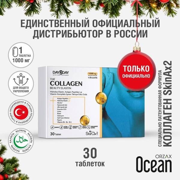 Reveal your radiant best with ORZAX DAY2DAY Collagen Beauty Elastin, a premium dietary supplement exclusively distributed in Russia by BioGlobus. This advanced formula is designed to support youthful, healthy skin. Each tablet delivers 1000mg of collagen peptides (1063.83mg hydrolyzed type I fish collagen peptides) plus 6% elastin peptides – the essential building blocks of firm, elastic skin. We've harnessed the power of 150mg of patented French SkinAx² anti-aging formula, enriched with primary and secondary antioxidants for enhanced skin rejuvenation.
