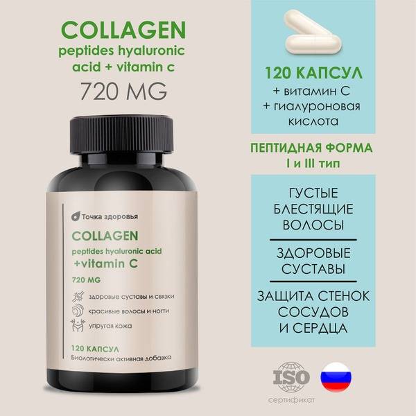 Keywords: collagen supplement, type 1 collagen, type 3 collagen, hyaluronic acid, vitamin c, skin health, hair health, joint health, anti-aging, wrinkle reduction, collagen production, beauty supplement, made in Russia, 720mg collagen, 120 capsules