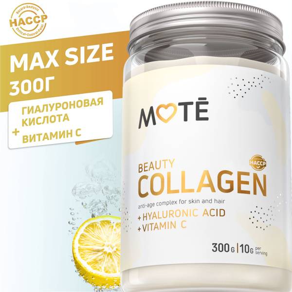 Mote Beauty Collagen: A comprehensive hydrolyzed collagen blend of bovine and marine collagen, enriched with Vitamin C and Hyaluronic Acid. Our collagen is presented in a readily bioavailable peptide form. Vitamin C, in the form of calcium ascorbate, is easily absorbed and gentle on the stomach. This collagen supports skin elasticity and firmness, helps prevent signs of aging, and strengthens hair and nails. It's unflavored and odorless, dissolves completely without residue, and features a natural formula free from artificial flavors. Enjoy it in your favorite beverage – juice, coffee, tea, or smoothie. Each serving is 10g. This jar contains 300g of collagen. State Registration Certificate No. AM.01.07.01.003.R.001250.11.22