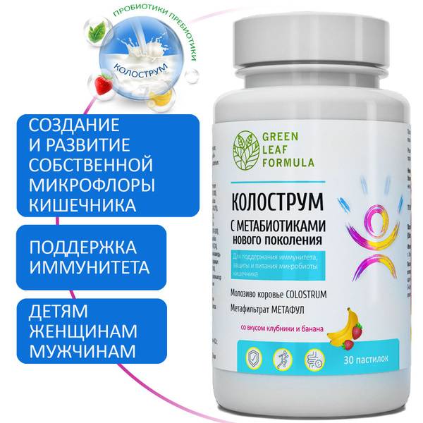 Support your immune system and gut health with our unique colostrum lozenges, featuring next-generation metabiotics and delicious strawberry & banana flavor. These dissolving tablets are suitable for children and adults, promoting natural immunity, improving metabolism, and fostering a healthy gut microbiome. Colostrum, also known as first milk, is renowned for its potent immunomodulatory properties, containing significantly higher concentrations of antibodies than regular milk, protecting newborns and boosting immune function. Our formula incorporates a metafiltrate with probiotic lysates, naturally utilizing lactic acid – a byproduct of beneficial bacteria – to cultivate a thriving gut flora. The "Metaful" metafiltrate is a metabiotic consortium of filtrates, prebiotics, and lysates from certified probiotic strains, cultivated using an innovative method for enhanced effectiveness in a dairy-free environment. This microbial consortium and its metabolites actively support a balanced gut microbiome, reduce inflammation, normalize intestinal pH, and promote the regeneration of intestinal epithelial cells. Free from titanium dioxide, artificial colors, GMOs, gluten, and lactose. Suitable for all ages with no known contraindications. Green Leaf Formula vitamins and supplements are your daily commitment to health. Our products are certified and manufactured in a leading Russian facility, undergoing rigorous multi-stage quality control. Continuous laboratory testing of raw materials and finished products is conducted by a laboratory accredited by the Russian national accreditation system (Rosaccreditation). Our adherence to ISO 22000:2005, GMP standards, and strong scientific foundation guarantees the highest quality product.