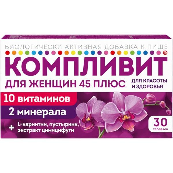 Complivita, women's vitamins, 45+, menopause vitamins, menopause support, hormonal balance, vitamin complex, mineral complex, black cohosh, magnesium, B vitamins, motherwort, antioxidants, L-carnitine, weight management, women's health, beauty supplements, serenity, well-being, dietary supplement, tablets, 30 tablets.