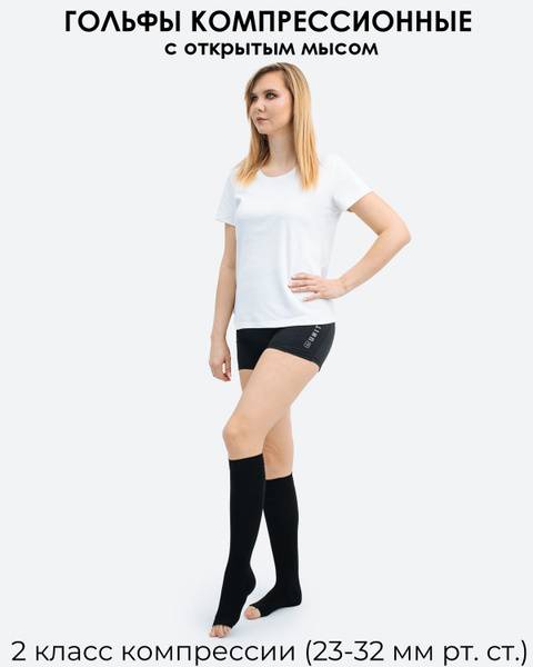 Breathable, moisture-wicking, antibacterial material with optimal compression properties. Special knitting technology for different body parts. Optimal pressure distribution. Soft edges that do not cut into the skin. Open toe. Uses "A" class complex yarns with double S-shaped braiding in opposite directions for added durability. Meets compression class 2 (23-32 mmHg) standards.