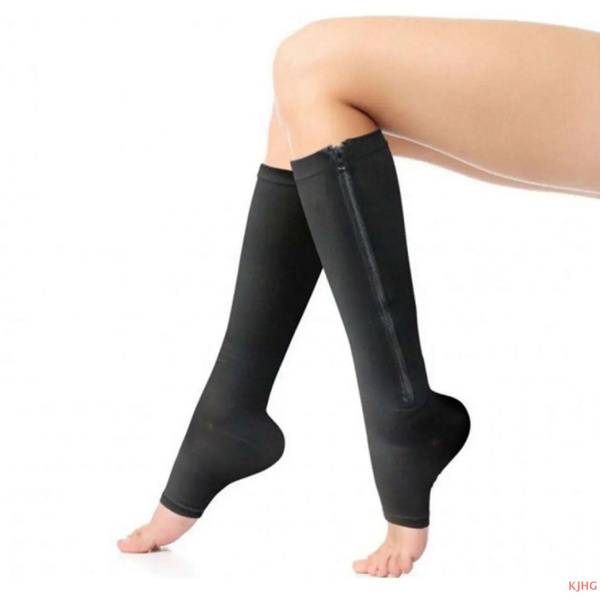 Description: Experience superior comfort and support with these black, Class 1 compression socks featuring a convenient zipper closure. Designed to alleviate swelling and pain associated with poor circulation in the legs and calves, these socks effectively prevent common issues like leg heaviness, edema, and soreness. Crafted from a breathable and elastic blend of 96% nylon and 4% spandex, they seamlessly transition from athletic wear to elegant footwear (toe-less design). The comfortable, pressure-free toe area ensures all-day wearability, while the discreet design remains invisible under clothing. Enjoy improved circulation and reduced discomfort with these premium compression socks.