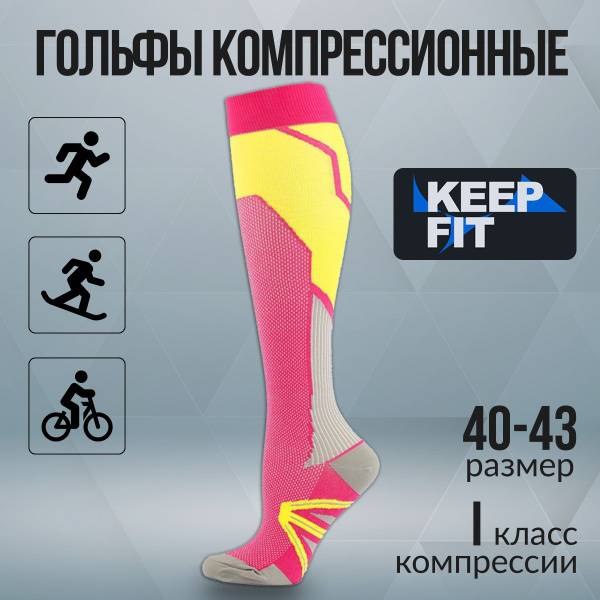 Experience the comfort and support of KEEP FIT compression socks. Ideal for active individuals, those with standing or sedentary jobs, and expectant mothers, these Class 1 compression socks provide relief from aching, swollen, and tired legs. The breathable nylon and spandex blend gently compresses to improve circulation, reduce fatigue, and alleviate discomfort. Perfect for sports, long flights, and everyday wear. Consult your doctor before use if you have any underlying medical conditions. Available in pink and yellow. One pair included.