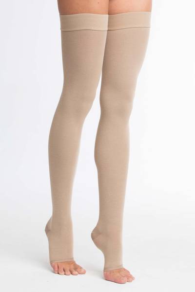 Center Compress offers premium 20-30 mmHg compression stockings in cream and beige, designed for effective treatment and prevention of venous disorders. Manufactured by Center Compress, a leading developer and producer of medical textiles for over 15 years, these thigh-high stockings feature an open toe and silicone top band for a secure, comfortable fit.