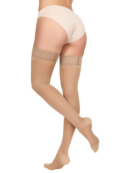 Treat and prevent venous diseases and lower limb lymphedema with ORTO 216 light beige compression stockings. These Class 1 medical compression stockings offer graduated compression for optimal therapeutic benefits. The innovative EXTRADULL polyamide yarn provides exceptional durability, breathability, and a luxurious matte finish that resists pilling and fading. Experience superior comfort and ease of wear thanks to the carefully designed construction, including a refined toe and heel for a sleek, invisible look under footwear. The elegant lacy top adds a touch of style, while the clearly marked size on the foot ensures easy selection.