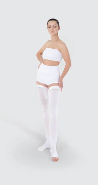 ORTO Class 1 compression stockings provide gentle yet effective compression therapy (18-22 mmHg) to help prevent venous thromboembolic events (VTEs), such as deep vein thrombosis (DVT) and pulmonary embolism (PE). These white stockings are designed for hospital use and feature a comfortable silicone band to ensure a secure and comfortable fit. An elasticated inner thigh panel provides additional support, while the open toe and knitted heel design enhance breathability and prevent irritation.