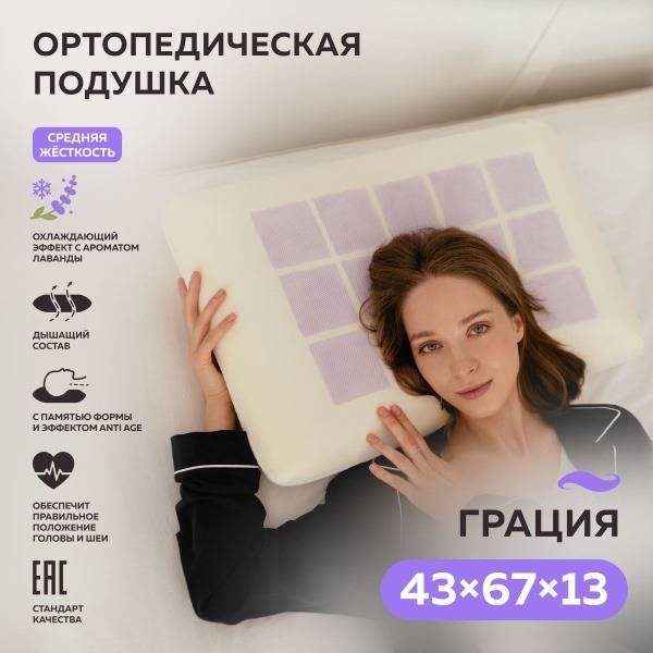 TRIGUR Grace is an orthopedic pillow designed for improved sleep quality and comfort. It features a viscoelastic foam filling with a memory effect, providing tailored support for the head and neck. The pillow includes a cooling gel layer with a lavender scent, offering a refreshing and calming experience during sleep.