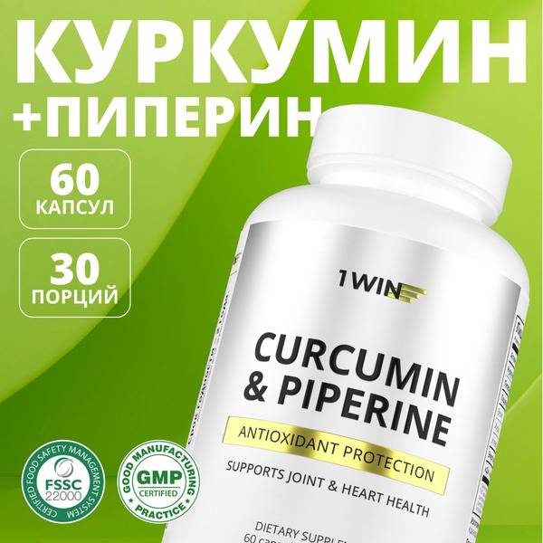 1WIN Curcumin + Piperine is a dietary supplement formulated for immune support and overall wellness. It combines a curcumin extract from turmeric root with a black pepper fruit extract (piperine) in a vegetable capsule intended for adult use as part of daily nutrition.
