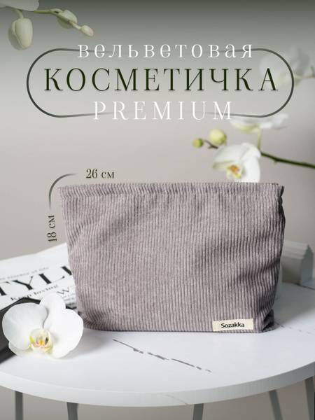 A medium textile cosmetic bag in gray velvet designed for organized storage of personal care and cosmetic items. The soft-touch construction and lined interior provide a gentle environment for brushes, compacts, and everyday accessories.