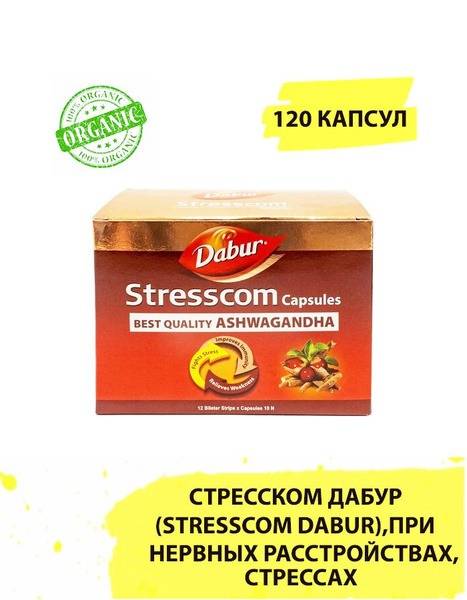Experience natural stress relief with Dabur Stresscom Capsules. This 120-count bottle provides a convenient and effective way to manage daily stress and promote relaxation. Formulated with traditional Ayurvedic herbs, Dabur Stresscom helps support a calm and balanced mind and body. Order your bottle today and discover the Dabur difference.