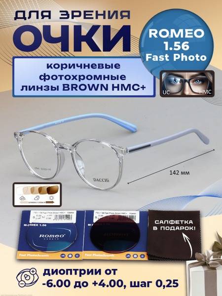 Description: Experience superior vision with DACCHI Model 37941 glasses featuring ROMEO FAST Photocolor 1.56 HMC+ photochromic lenses. Crafted with precision using advanced computer equipment from Essilor (France), these glasses are perfect for everyday wear and reading. The lenses offer a comfortable 80% darkening effect, adjusting to changing light conditions (less dark in high temperatures, darker in low). These high-quality lenses are ideal for correcting myopia and hyperopia (optimal range: +6.00 to -6.00).