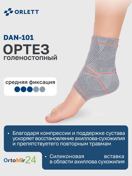 The DAN-101 Orlett Dynamic Ankle Brace provides compression and support to accelerate Achilles tendon recovery and prevent re-injury. Featuring a special silicone insert for the Achilles tendon, this brace offers medium support and utilizes the unique PROPRIOPRESSION® knitting technology. This innovative technology, made with unique materials, demonstrably enhances proprioception (muscle sense) and joint security. Natural thermo- and moisture regulation, plus a micro-massage effect in stressed areas, promote faster healing and exceptional comfort during any activity. The Orlett Energy Line DAN-101 is indicated for: Achilles tendon injury and post-surgical rehabilitation; Achilles tendinopathy, tendinitis, paratenonitis, retrocalcaneal bursitis, and Haglund's deformity; and prevention of Achilles tendon injuries, especially in sports. Sizing: Measure the circumference above the ankle bones with a tape measure (snugly, but not constricting).