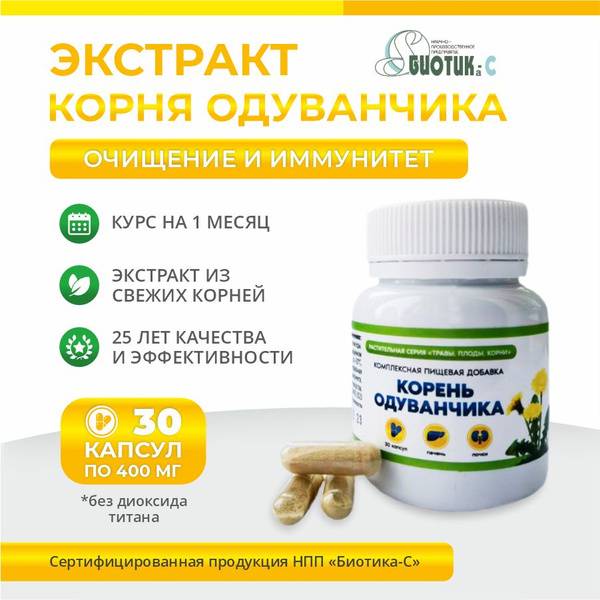 Dandelion root, dandelion root extract, Biotika-S, swelling, edema, detox, cleanse, liver support, digestive health, constipation, hemorrhoids, skin health, eczema, furunculosis, metabolic support, cholesterol, blood sugar, immune support, energy boost, fatigue, insomnia, anemia, atherosclerosis, natural remedy, herbal supplement, capsules, 400mg, 30 capsules.