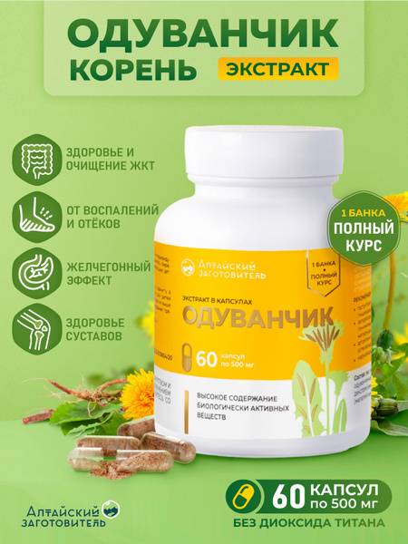 Altai dandelion root, dandelion root extract, dandelion capsules, digestive health, liver support, kidney support, cardiovascular health, immune support, skin health, joint pain, arthritis, arthrosis, gout, anemia, hemorrhoids, mastopathy, blood sugar, saponins, vitamins, minerals, herbal supplement, natural remedy, Altai herbs, Altai mountains, 60 capsules, 500mg.