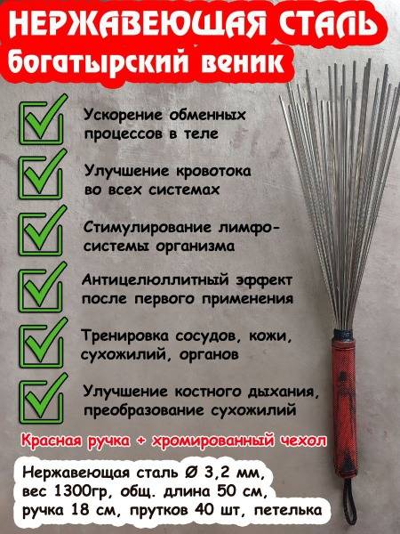 Experience the invigorating power of the Bogatyr Daoist massage beater, meticulously crafted for deep muscle work. This robust tool features a durable stainless steel construction (Ø 3.2mm, 1300g, 50cm total length) with a comfortable 18cm red handle and 40 sturdy rods. A chrome-plated case is included for convenient storage and protection. This beater is specifically designed for men and offers significant advantages over other models: