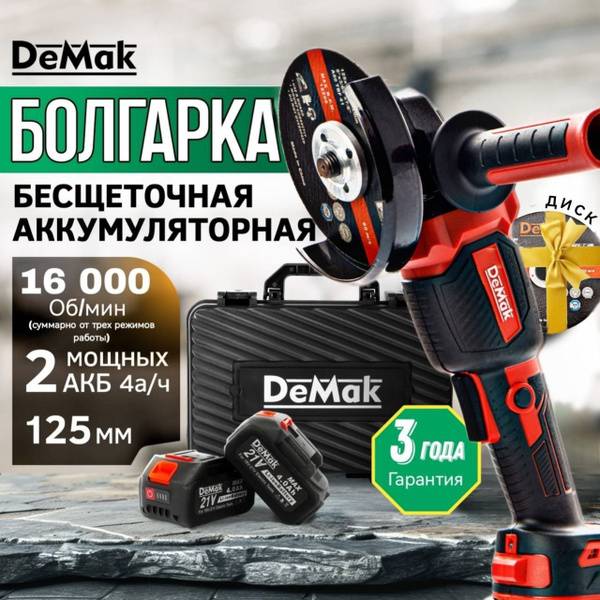 This versatile tool functions as a powerful angle grinder, cut-off tool, and even a tile cutter, making it indispensable for a range of tasks. The kit includes a durable carrying case, charger, extra battery, and a comprehensive Russian instruction manual. Backed by a 3-year warranty, this DeMak angle grinder delivers reliable performance and long-lasting durability, making it a valuable addition to any workshop.