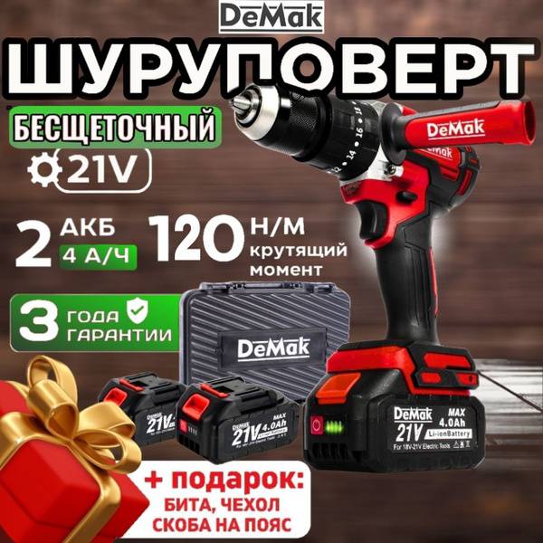 The DeMak cordless drill driver boasts a powerful, indestructible brushless motor with 100% overload and overheat protection. This 21V impact driver delivers 120 Nm of maximum torque, effortlessly driving screws and bolts into wood and metal. Its METAL chuck is 5 times more durable than plastic alternatives, and the quick-release 13mm chuck allows for rapid bit changes. A comfortable, rubberized grip ensures secure handling and prevents slippage. A bright LED light enhances precision in low-light conditions. Featuring a 1/2" chuck mount, this versatile tool operates in high and low speeds, and includes a trigger lock for safety and a convenient reverse function. The informative display shows battery level and operational mode. The DeMak drill driver's ergonomic design and high-quality matte ABS plastic casing make it the perfect gift for any DIY enthusiast or professional. Includes two 4Ah batteries and a carrying case. Ideal for ice augers.