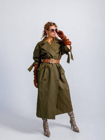 The DEMKINALEBEDEVA trench coat is the ultimate spring staple for the modern woman. Inspired by classic military styling, this double-breasted trench coat offers a timeless elegance with contemporary comfort. Its relaxed, straight cut allows for unrestricted movement, while the detachable belt cinches the waist to create a flattering silhouette that complements any figure. A unique flyaway yoke at the back adds a touch of sophistication. The generously cut sleeves offer a comfortable, relaxed fit.