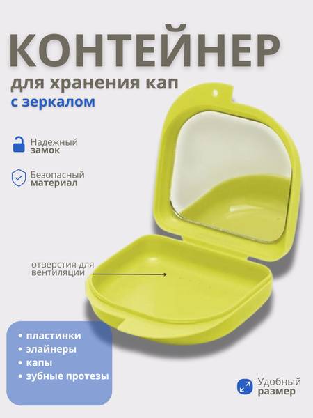 </section> <section>This essential dental case with a built-in mirror provides safe and hygienic storage for all your dental needs. Perfect for dentures, retainers, mouthguards (for alignment, snoring, bruxism, sleep), and veneers. Made from secure, airtight, non-toxic plastic, this case is odor-free and easy to clean. Its ergonomic design features a tight lid and a convenient separator with a handle for easy item removal. Compact and portable, it’s ideal for travel and daily use.
