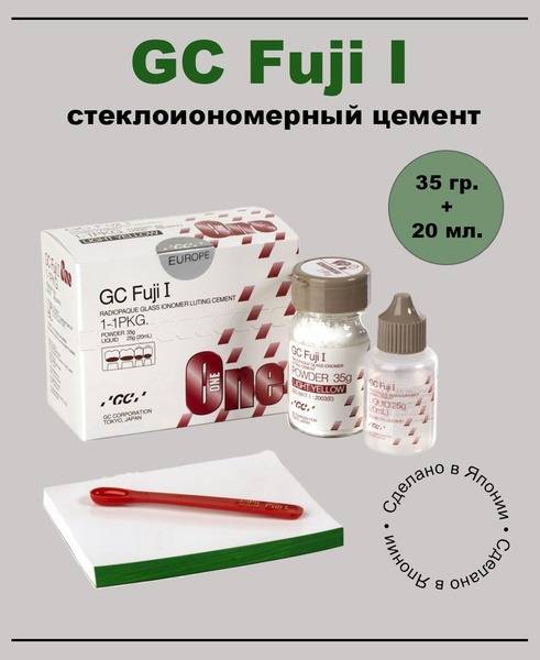 GC Fuji I, glass ionomer cement, crown cement, bridge cement, dental cement, permanent cementation, chemically cured cement, biocompatible cement, low sensitivity cement, fluoride releasing cement, dental materials, restorative dentistry, GC Corporation, powder and liquid cement, mixing pad, dental adhesive.