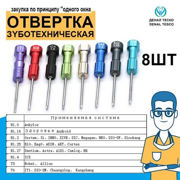 This premium 8-piece dental implant driver set is designed for precision and efficiency in implant placement procedures. The set includes eight micro-screwdrivers with precisely engineered tips compatible with a wide range of popular implant systems, including Astra, Friodent, Ankylos, Nobel Biocare, Dentium, Osstem, Megagen, Alphabio, Adin, Biohorizont, and Straumann.