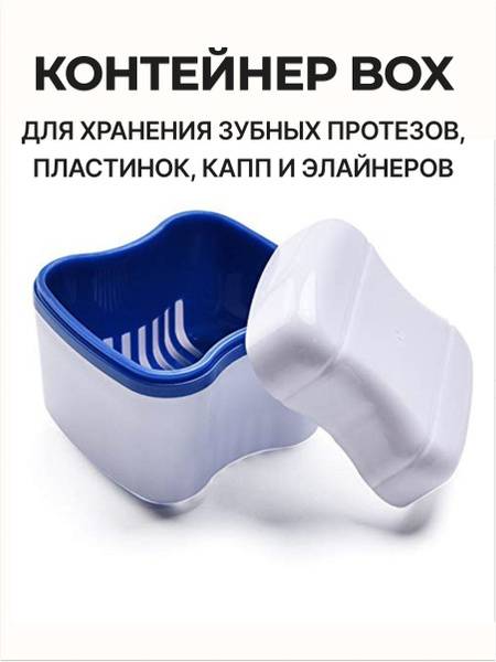 dental prosthesis container, denture storage container, retainer case, aligner case, night guard case, mouthguard case, orthodontic appliance storage, dental cleaning container, denture cleaner container, removable dental appliance storage, food-safe plastic container, drainage grid, denture tray.