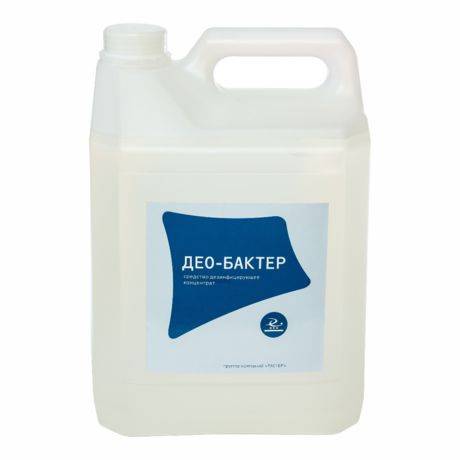 Disinfectant, DEO-BAKTER, concentrate, 5 liters, quaternary ammonium compounds (QACs), alkyldimethylbenzylammonium chloride, bactericidal, virucidal, fungicidal, broad-spectrum, healthcare, medical, dental, cleaning, deodorizing, hospital, clinic, sterilization, hygiene, infection control, isopropyl alcohol, non-ionic surfactant, pH 7.5, tuberculosis, nosocomial infections, Poliovirus, Candida, Aspergillus niger, Mucor spp., surface disinfection, equipment disinfection, medical instruments, dental instruments, working solution, shelf life.