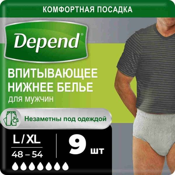 Experience superior comfort and protection with Depend Men's Underwear, size L/XL (waist 48-54 inches, weight 52-86 kg). Designed specifically for male anatomy, these adult incontinence briefs offer reliable day and night protection that's 5 times more absorbent than a regular pad. The advanced design features rapid-wicking channels and odor-eliminating filters, ensuring discreet confidence all day long. Enjoy the soft, stretchy fit of Depend underwear—comfortable enough to feel like regular underwear, yet powerfully absorbent and discreet under clothing. Low-rise design for a comfortable, secure fit. 9 count per pack.