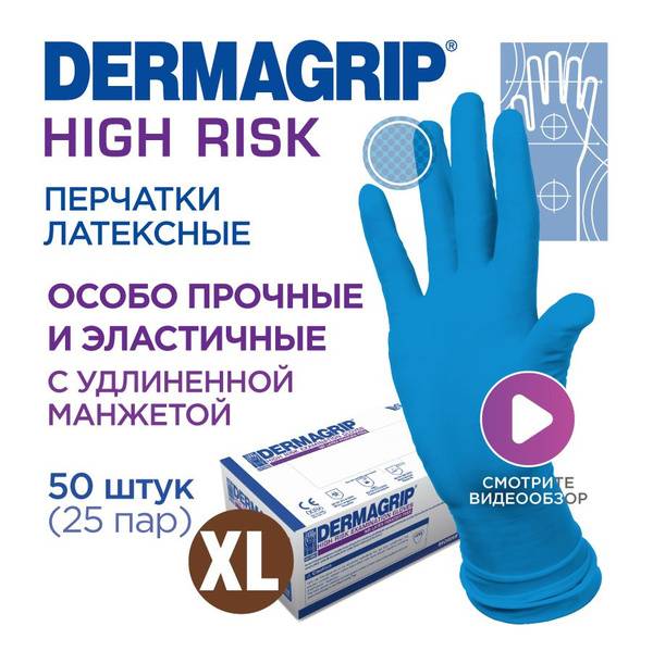DermaGrip High Risk XL latex gloves offer superior protection against harsh chemicals and mechanical damage. These extra-heavy-duty, powder-free gloves are made from natural latex, boasting a thickness 2.5 times greater than standard gloves for exceptional durability. Their extended length (minimum 29cm) provides added forearm protection. Specifically designed for high-risk environments, they withstand: