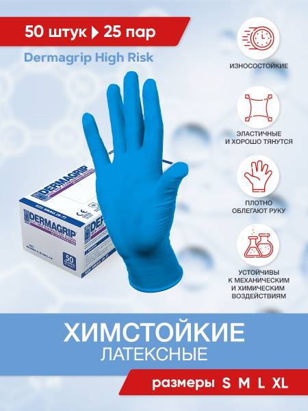 Dermagrip High Risk latex gloves offer superior protection for high-risk environments. 2.5 times thicker than standard examination gloves, these XL gloves feature an extended 290mm cuff for enhanced forearm protection and exceptional resistance to mechanical damage. They provide superior resistance to a wide range of chemicals and antiseptics, while the textured fingertips ensure a secure grip on instruments. Suitable for extended use (several days) in various applications.