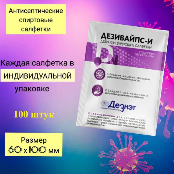 "description": "Desivayps-I antiseptic wipes provide hygienic hand cleansing, prophylactic foot disinfection, and surface disinfection of various items including medical equipment, furniture, and office technology. Ideal for injections, these 60x100mm wipes come in convenient sachets (100 count).",