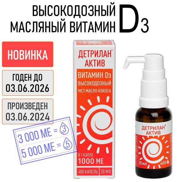 Vitamin D3, Detrilan Active, high-potency vitamin D3, vitamin D supplement, natural vitamin D3, coconut oil vitamin D3, 1000 IU vitamin D3, 2000 IU vitamin D3, 5000 IU vitamin D3, precise dosing, no preservatives, adult supplement, dietary supplement, health supplement, immune support, bone health.