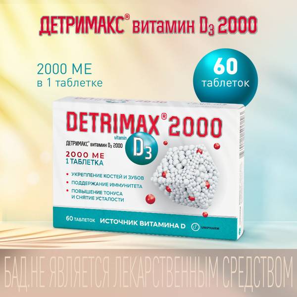 Detrimax Vitamin D3 2000 IU provides a potent dose of vitamin D3, an essential fat-soluble vitamin crucial for immune support, reducing the risk of colds, strengthening bones and teeth, combating fatigue, boosting energy levels, maintaining muscle strength, improving cognitive function and memory, and supporting reproductive health. Each tablet delivers 2000 IU of vitamin D3. Detrimax Vitamin D3 2000 is GMO-free, gluten-free, lactose-free, and titanium dioxide-free. Boost your immunity easily with Detrimax*. *Due to the risk of tablet splitting, it is recommended to take whole tablets.
