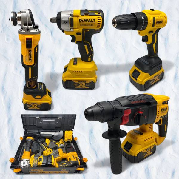 DEWALT, cordless, combo kit, brushless, hammer drill, angle grinder, impact driver, impact wrench, 18V, 5Ah battery, power tools, DIY, professional tools, 4-in-1, 26mm drill, 125mm disc, 90Nm, 600Nm, LED light, cordless tools, power tool combo, brushless motor, high torque, heavy duty.