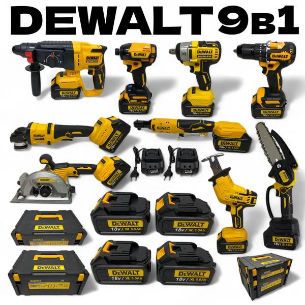 Keywords: DEWALT, 9-in-1, cordless, brushless, power tool combo kit, 18V, 5Ah, batteries, chargers, rotary hammer, angle grinder, impact driver, impact wrench, hammer drill, circular saw, chainsaw, angle wrench, reciprocating saw, power tools, DIY, professional tools, construction tools, tools kit, cordless tools, brushless motor, high-torque, long-lasting battery, heavy-duty, home improvement, power tool accessories, DeWalt power tools