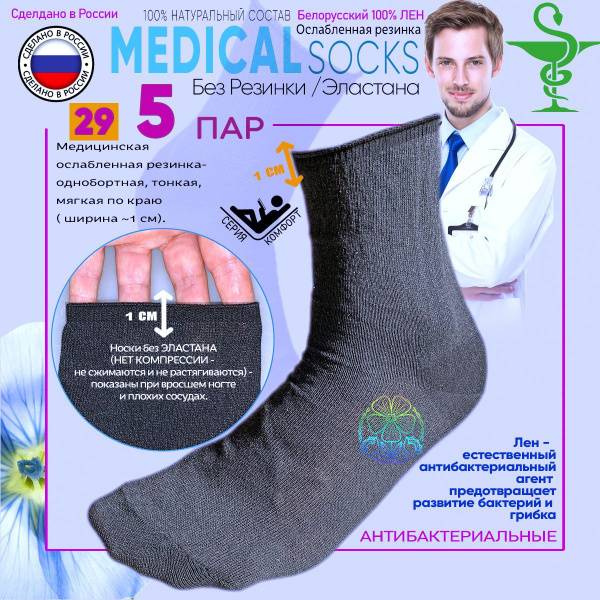 Experience superior comfort and health with these men's diabetic socks, expertly crafted without restrictive elastic. Designed for 24/7 wear, these 5 pairs of black, anatomical socks provide gentle support and breathability for sensitive feet. Ideal for those with diabetes, edema, neuropathy, circulatory issues, or simply seeking all-day comfort, these socks feature a non-constricting design that promotes healthy blood flow. Perfect for standing professions, pregnancy, seniors, and anyone with swollen ankles or feet. Made in Russia from 100% cotton and linen, these socks conform to GOST 8541-2014 standards, ensuring exceptional quality and durability. Their soft, breathable fabric wicks away moisture, keeping your feet dry and comfortable all day and night. A thoughtful gift for birthdays, holidays, or simply a treat for yourself – experience the difference of truly comfortable socks. "These socks are excellent! I've bought them several times now. My feet breathe, they don't sweat, and the absence of an elastic band is fantastic; just a high-quality, finished seam." - Customer Review.