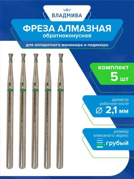 Experience superior nail care with this 5-piece set of 2.1mm inverted cone diamond burs. Featuring a coarse grit, these burs are ideal for a range of professional manicure and pedicure applications including nail extensions, intricate designs, nail plate correction, and the gentle treatment of hardened skin. Manufactured by TD "VladiMiva," these burs boast an reinforced texture for exceptional durability and wear resistance, offering double the lifespan of standard burs. The coarse grit is indicated by a green band, ensuring precise material removal. Effortlessly disinfectable and an essential addition to any professional nail technician's toolkit.