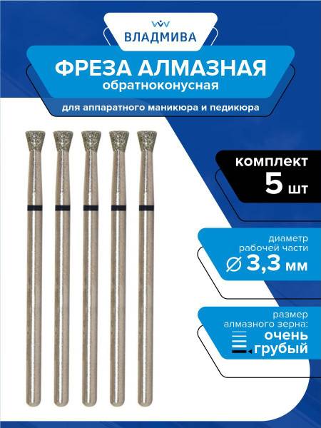 Professional 3.3mm extra coarse diamond tapered bur set, featuring a black grit marking. This 5-piece collection from TD "VladMiVa" is designed for advanced nail artistry, including enhancement, design, and correction. Ideal for cuticle work and treating callused skin during manicure and pedicure procedures. The bur's reinforced texture ensures exceptional durability, doubling its wear resistance and lifespan. Easy to disinfect, this essential diamond bur is a must-have for any nail technician's e-file collection. (886.104.010.030.033)