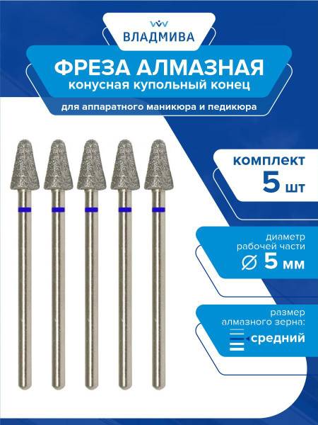 Elevate your nail artistry with this premium 5-piece set of diamond nail drill bits. Featuring a versatile 5mm conical dome-end shape with medium grit, these bits are expertly designed for professional-grade manicures and pedicures. Ideal for nail enhancements, intricate designs, corrections, and effective cuticle and callus removal. The blue band signifies medium grit, perfect for a wide range of nail procedures. Crafted with a hardened texture for superior surface strength and durability, these diamond bits offer double the wear resistance and lifespan compared to standard bits. Easily disinfected and a fundamental component for any essential nail drill kit, including the 866.104.194.090.050 model. Experience precision, efficiency, and longevity with VladMiVa's high-quality nail drill bits.