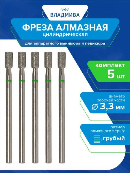 </section> <hr> <section>This professional 5-piece set includes diamond cylindrical burr bits with a coarse grit and a 3.3mm diameter. The set contains five diamond burrs, each featuring a cylindrical shape and coarse grit. The working part measures 3.3mm in diameter and 6.0mm in length. These diamond nail bits from TD "VladMiVa" are perfect for e-file manicures and pedicures, specifically for nail enhancements, design work, and corrections, as well as for treating rough skin. The burr's grit is identified by a color-coded band; a green band indicates coarse grit. The reinforced texture provides superior surface strength and hardness, doubling its wear resistance and lifespan. These durable manicure burrs are quick and easy to disinfect, making them a crucial component of any essential nail drill bit set for nail apparatus.