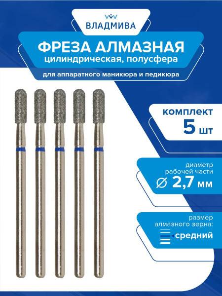 This 5-piece set features high-quality diamond burs with a cylindrical semi-sphere shape and medium grit. Each bur has a 2.7mm working diameter and an 8.0mm working length, identified by the product code 866.104.137.080.027.