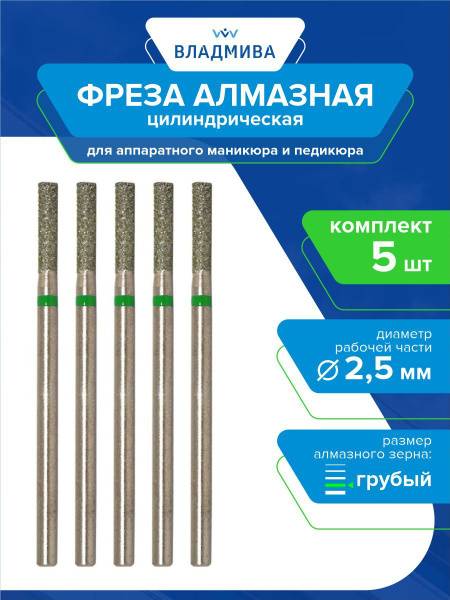 Discover a premium set of coarse grit diamond cylindrical burrs, each measuring 2.5mm. This 5-piece set (876.104.107.080.025) features high-quality diamond-coated burs designed for professional nail care.